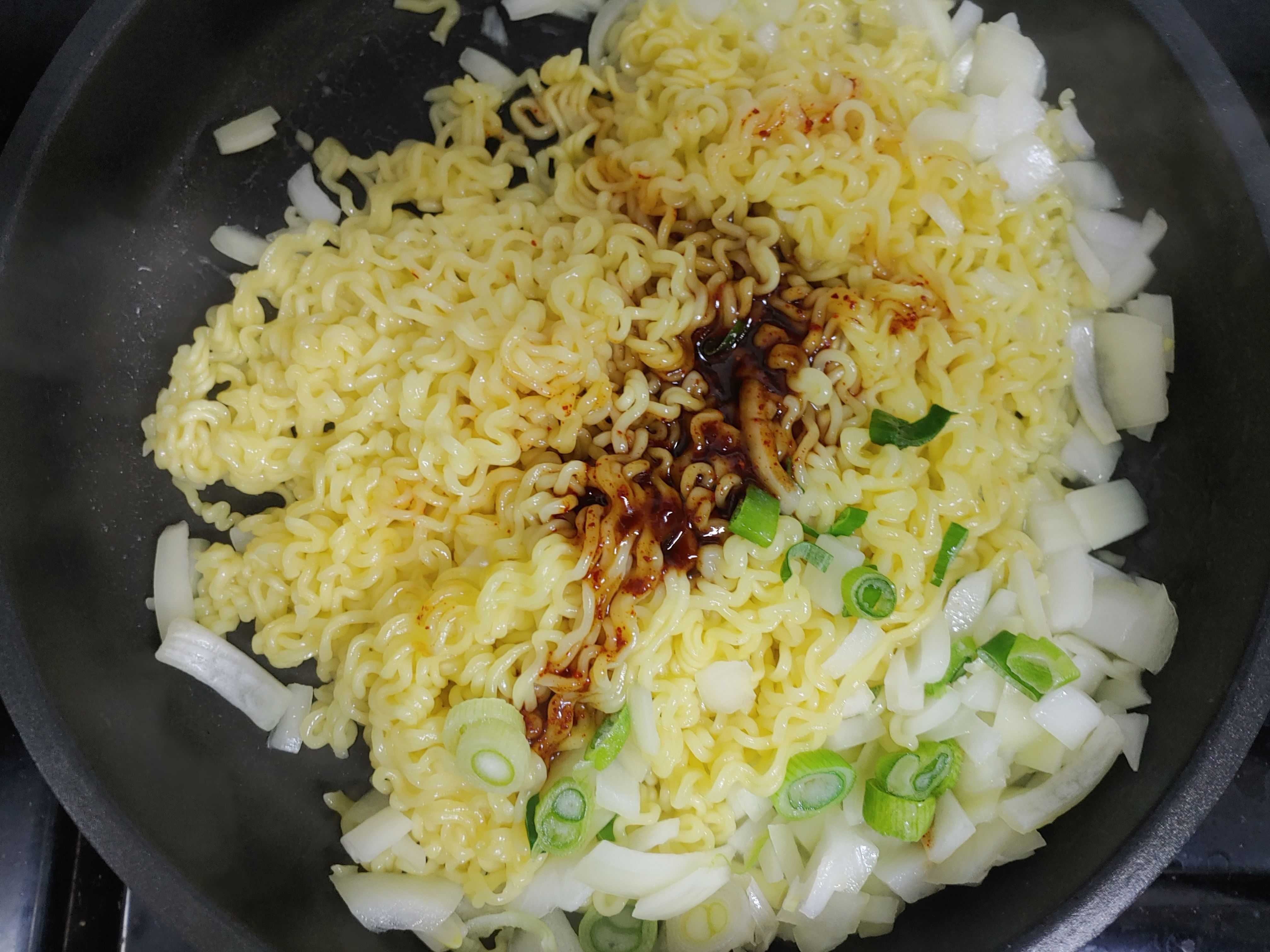 볶는다고 표현했지만 라면 끓이고 남은 물에 익힌다고 보는게 더 맞는것 같다.