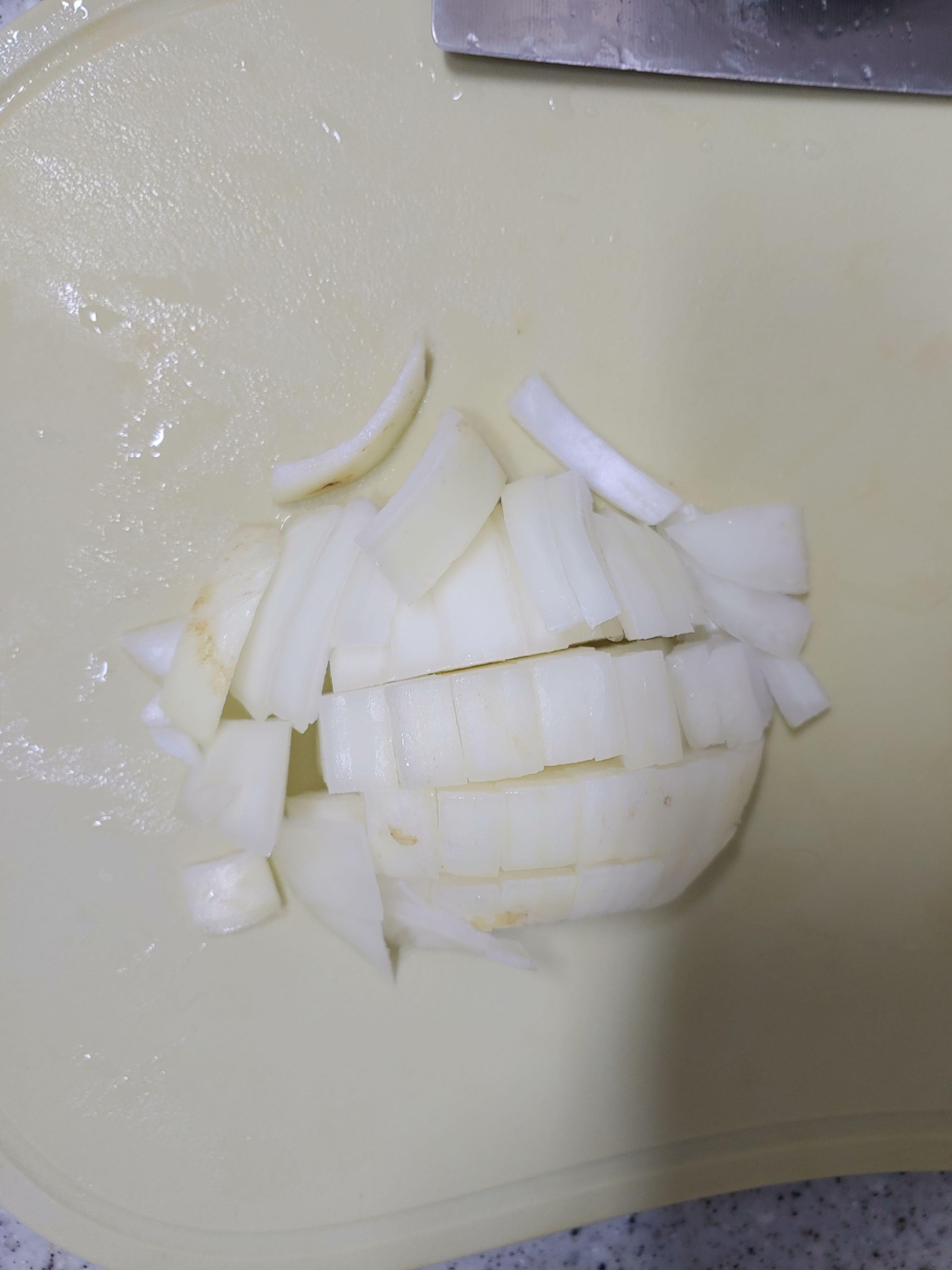 양파는 잘게 썰어주었고 대파는 잘게 썰어놓은걸 냉동실에 얼려놓은걸 사용했다. 고추나 양배추, 당근 등 다른 채소를 곁들여 먹어도 무방하다.