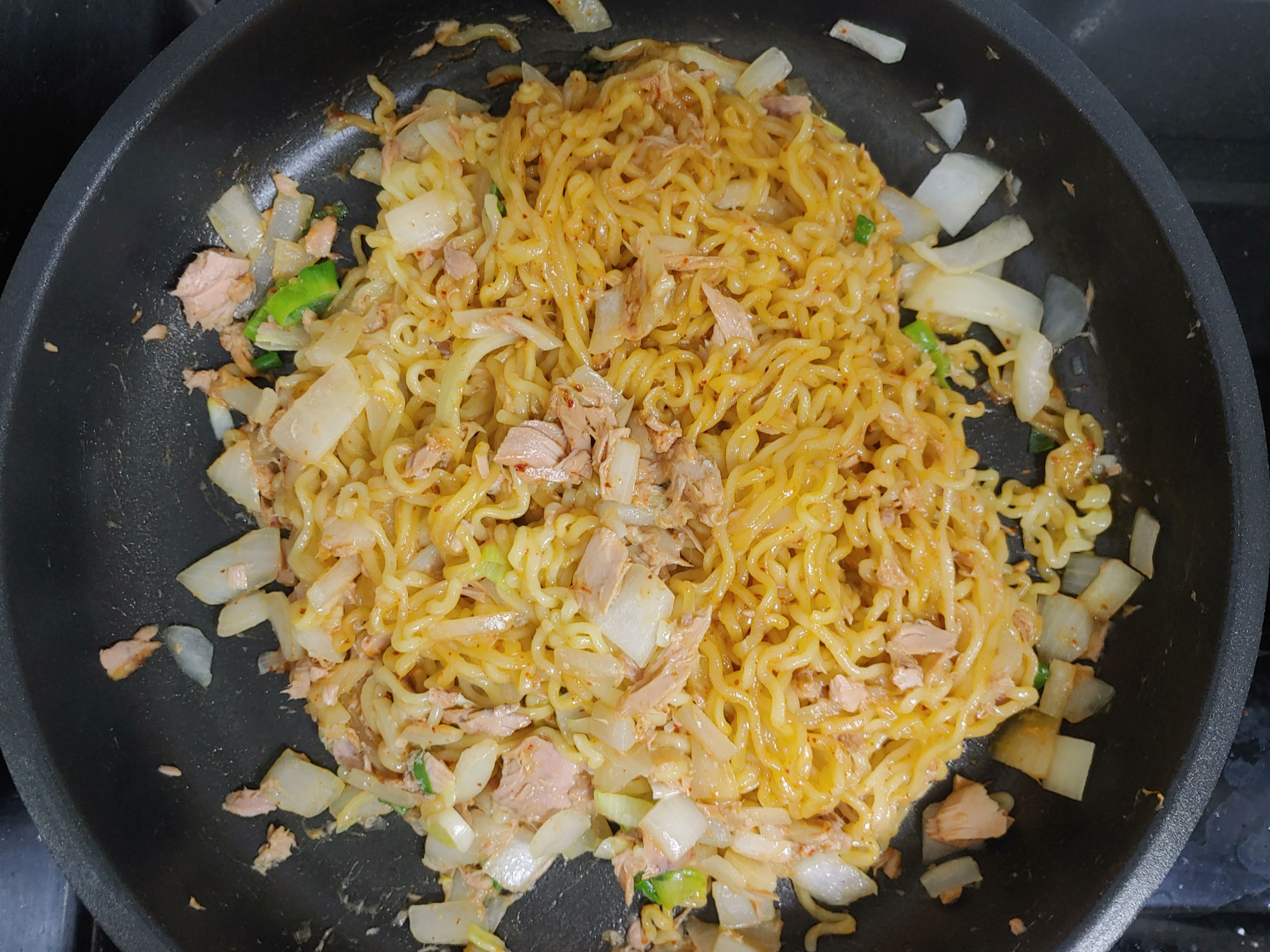 6. 소스와 참치를 넣고 섞어서 볶아주면 오늘의 참치볶음면 요리가 완성된다. ㅎㅎ