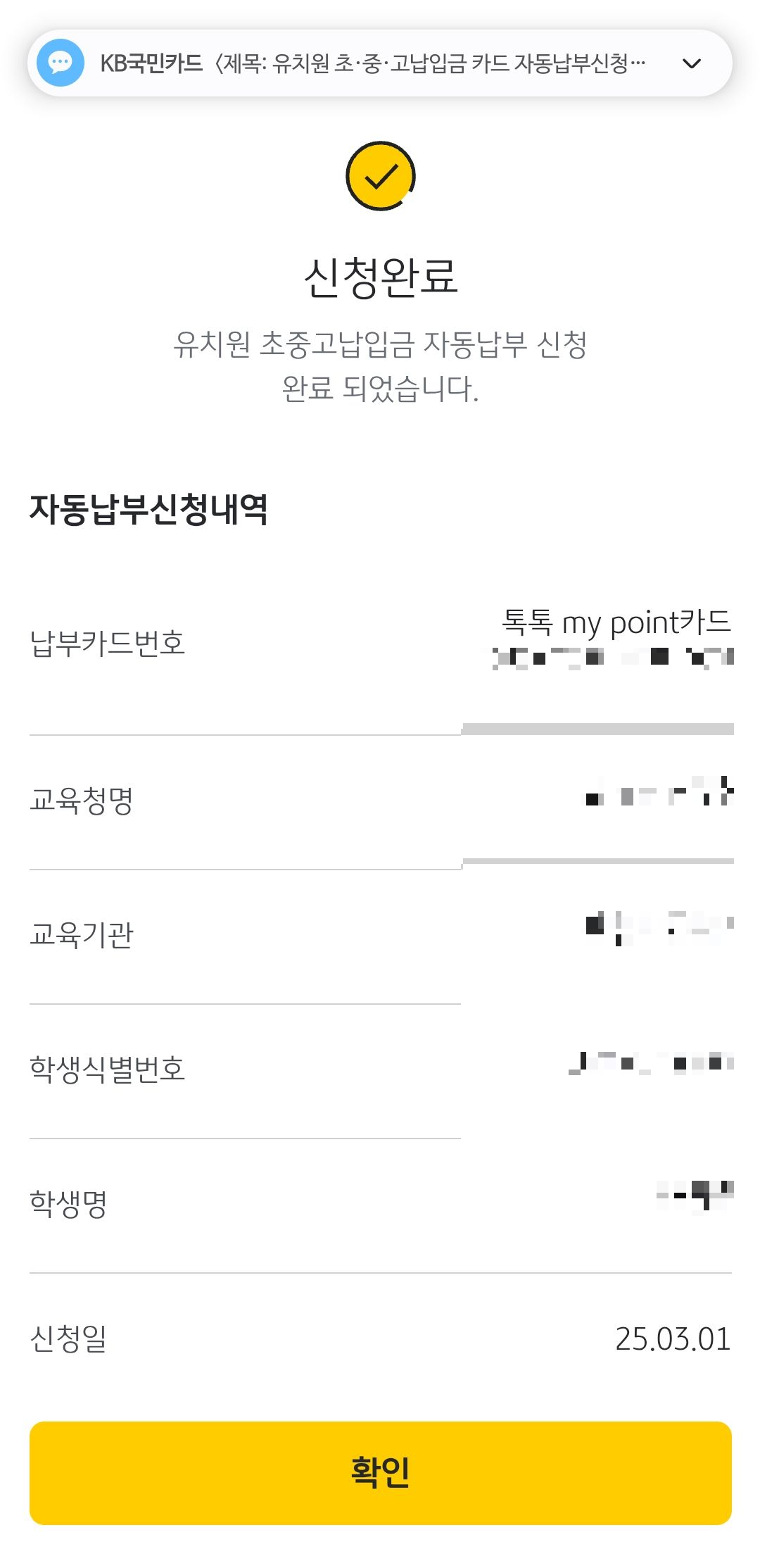 우리 아이가 다니는 학교의 행정실에서는 농협, 신한, kb, bc카드만 자동납부 신청이 가능했다. 지역마다, 교육청마다 지원되는 카드사가 다를 수 있으니 확인해야 한다. 이중에 쓰는 카드가 kb밖에 없어서 kb카드로 카드 자동납부를 신청했다.