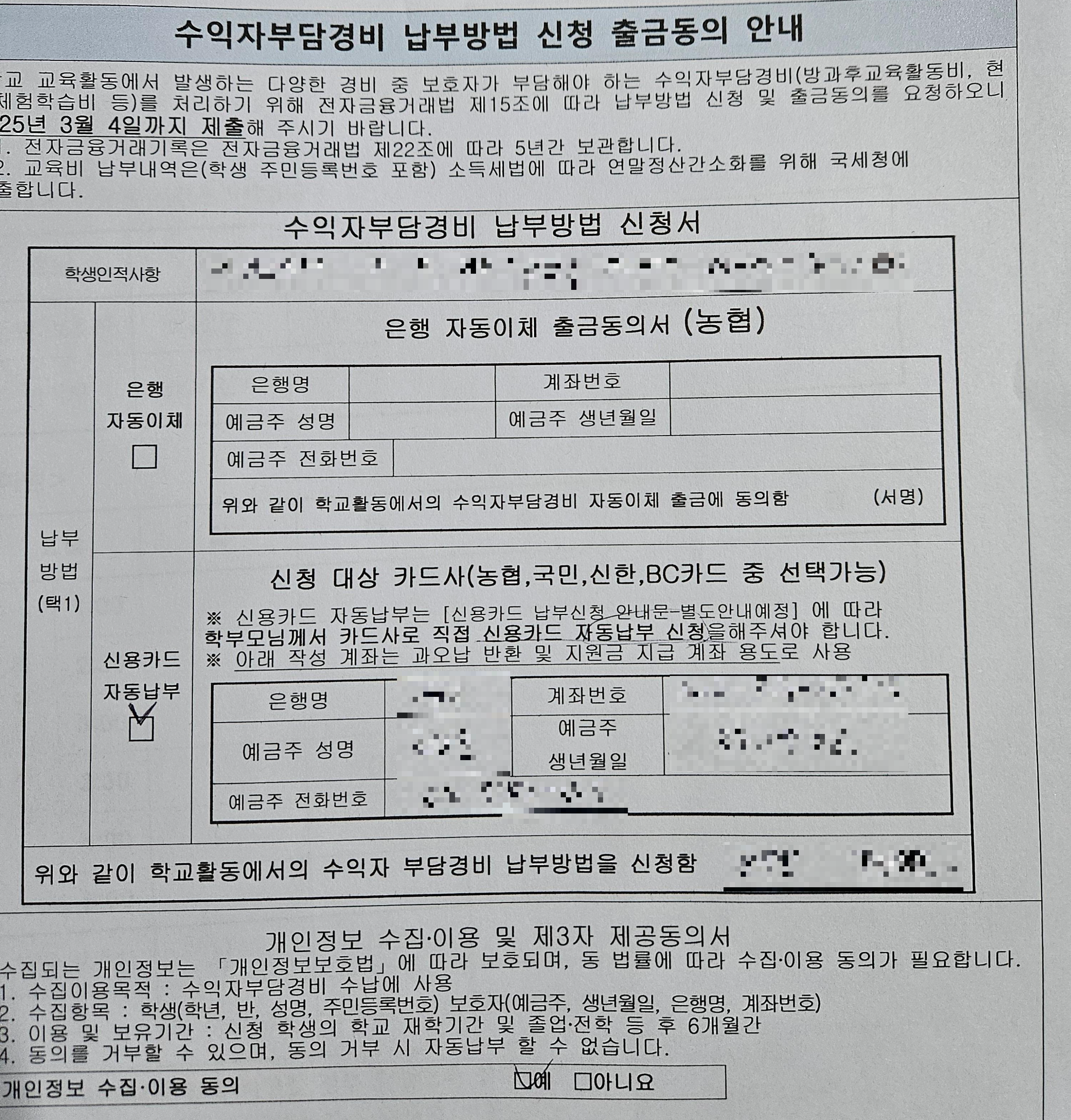카드 자동납부를 신청하고 동시에 아이가 다니는 유치원에서 나눠준 출금 동의 가정통신문을 제출해야 한다. 가정통신문에서 방과후활동비 납부 방법으로 카드 자동납부를 선택하고, 과오납 경우 환불받을 수 있는 은행계좌를 적어서 제출하면 된다.