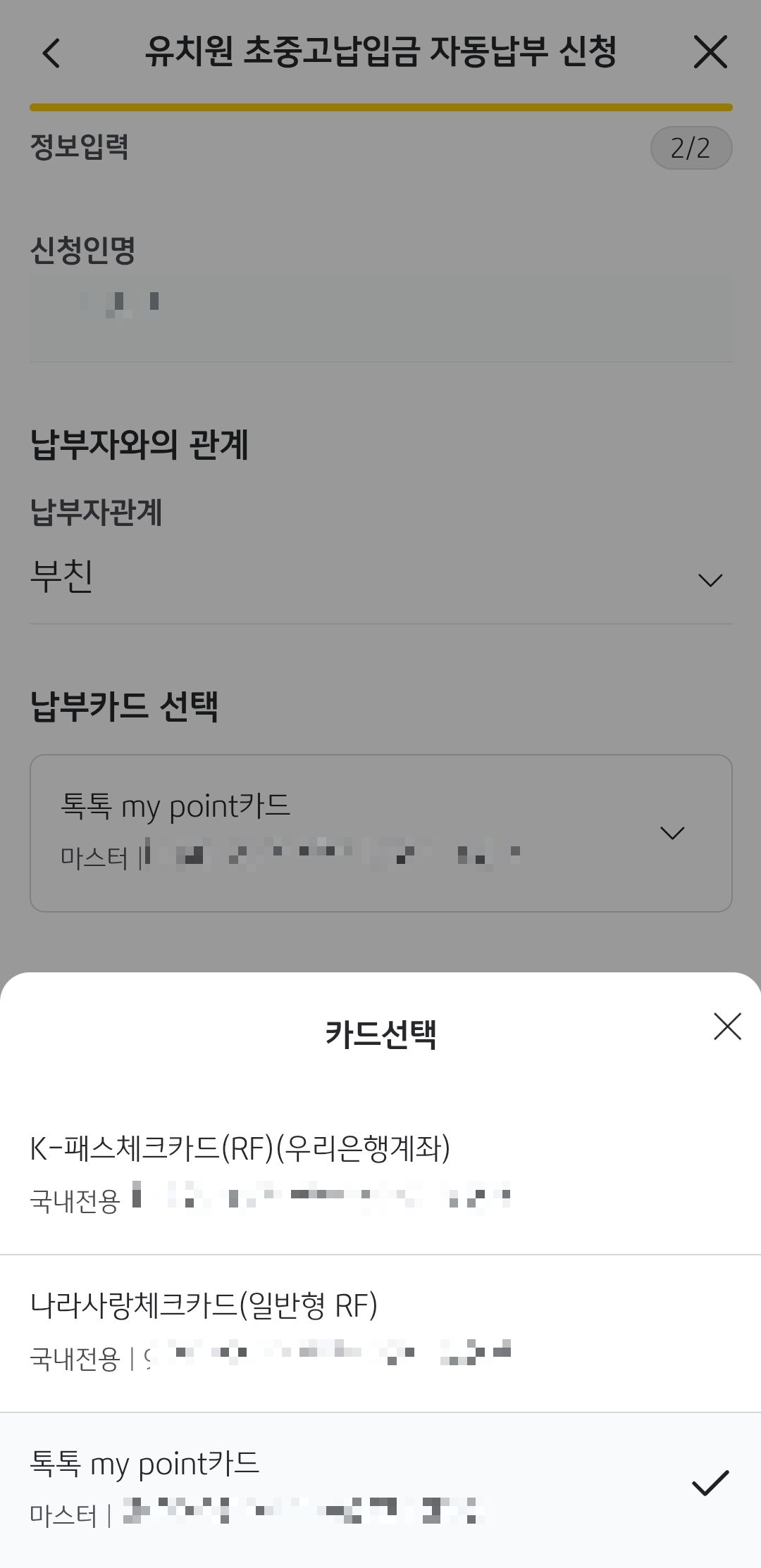 카드 자동납부만 선택하고 가정통신문을 제출하지 않으면 제대로 이체가 되지 않을 수 있으니 유의해야 한다.