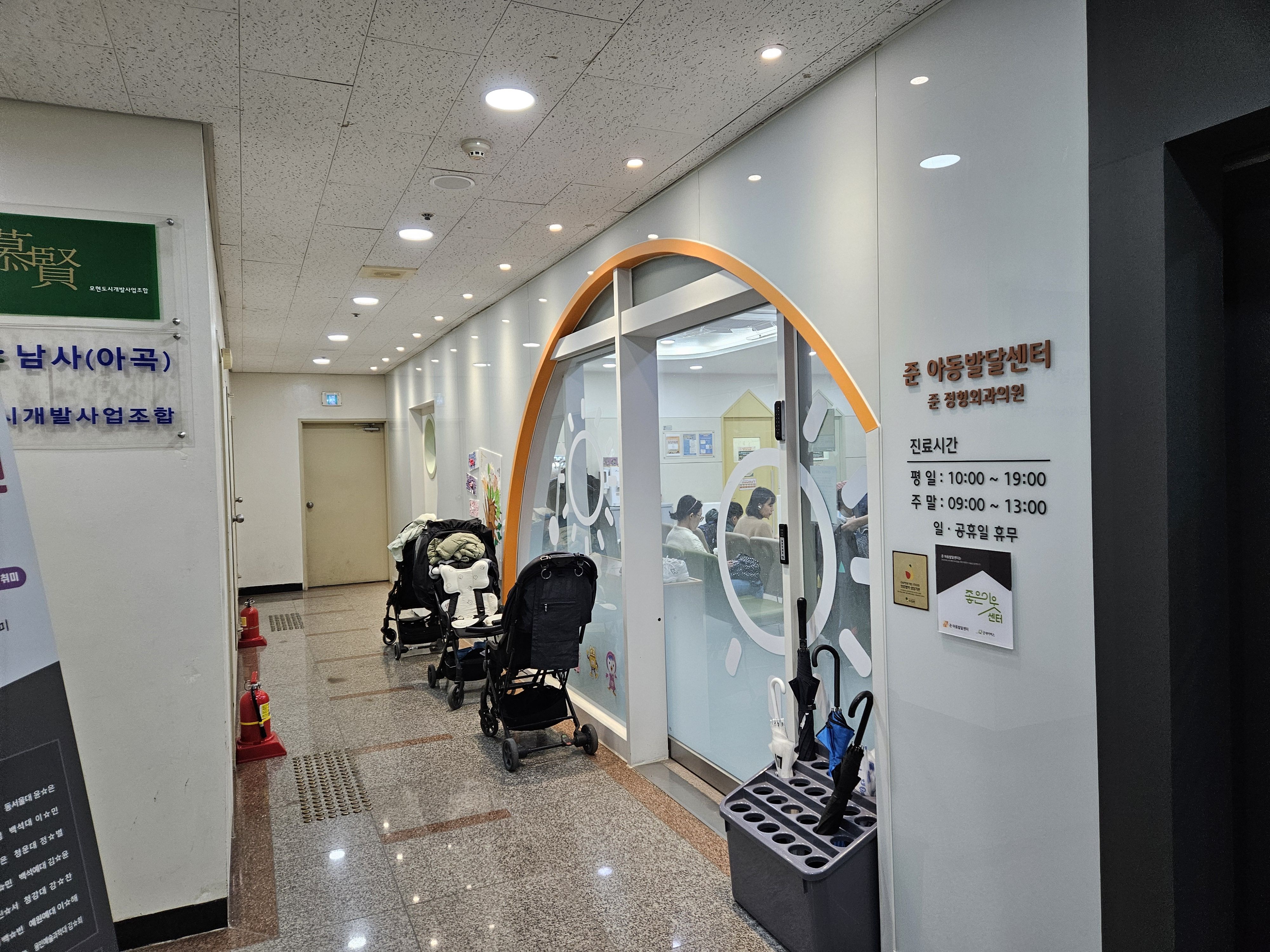 준 발달센터는 건물 2층과 7층에 있다. 7층이 메인이고 2층은 보조다. 우리 아이 치료는 2층에서 진행되는데, 수납은 7층에 가서 해야 해서 다소 불편함이 있다(발달센터가 있는 건물에 엘리베이터가 한 개 밖에 없어서 진짜 늦게 온다). 원래 2층에는 치료실이 없었는데 사업이 잘 되어서인지 2층까지 치료실을 확장했다. 아래는 7층 메인 준 센터 입구 모습이다. 갈 때마다 항상 사람과 아이들로 붐빈다.
