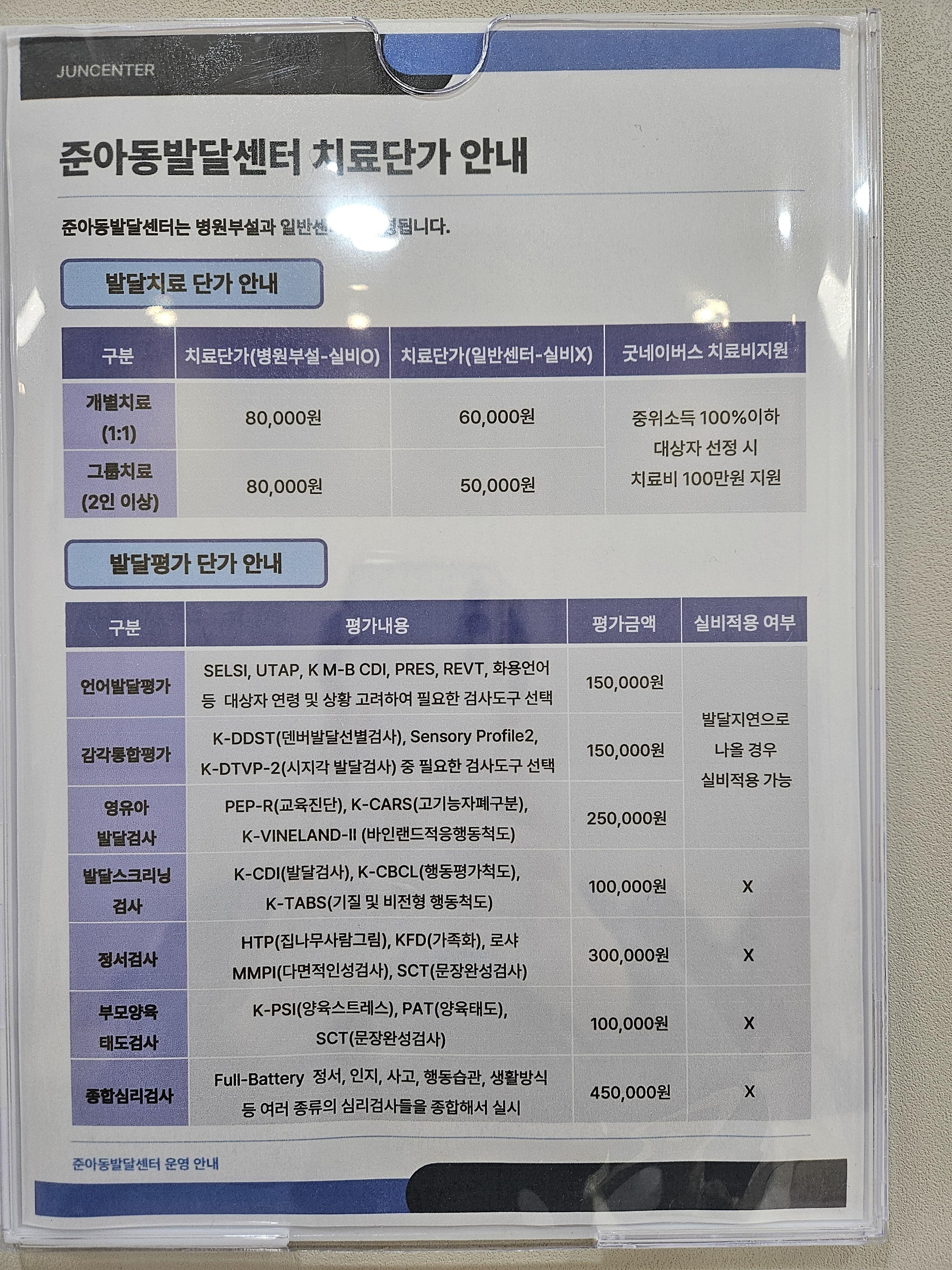 이후 발달센터에서도 치료비를 이원화했다. 실손보험 처리가 되는 병원부설 치료의 경우에는 1회당 8만 원, 그 외 치료에 대해서는 6만 원으로 비용이 다소 인하되었다. 대부분의 발달센터가 그렇듯 준 발달센터도 당일 취소는 특별한 사유가 없는 한 환불되지 않는다.
