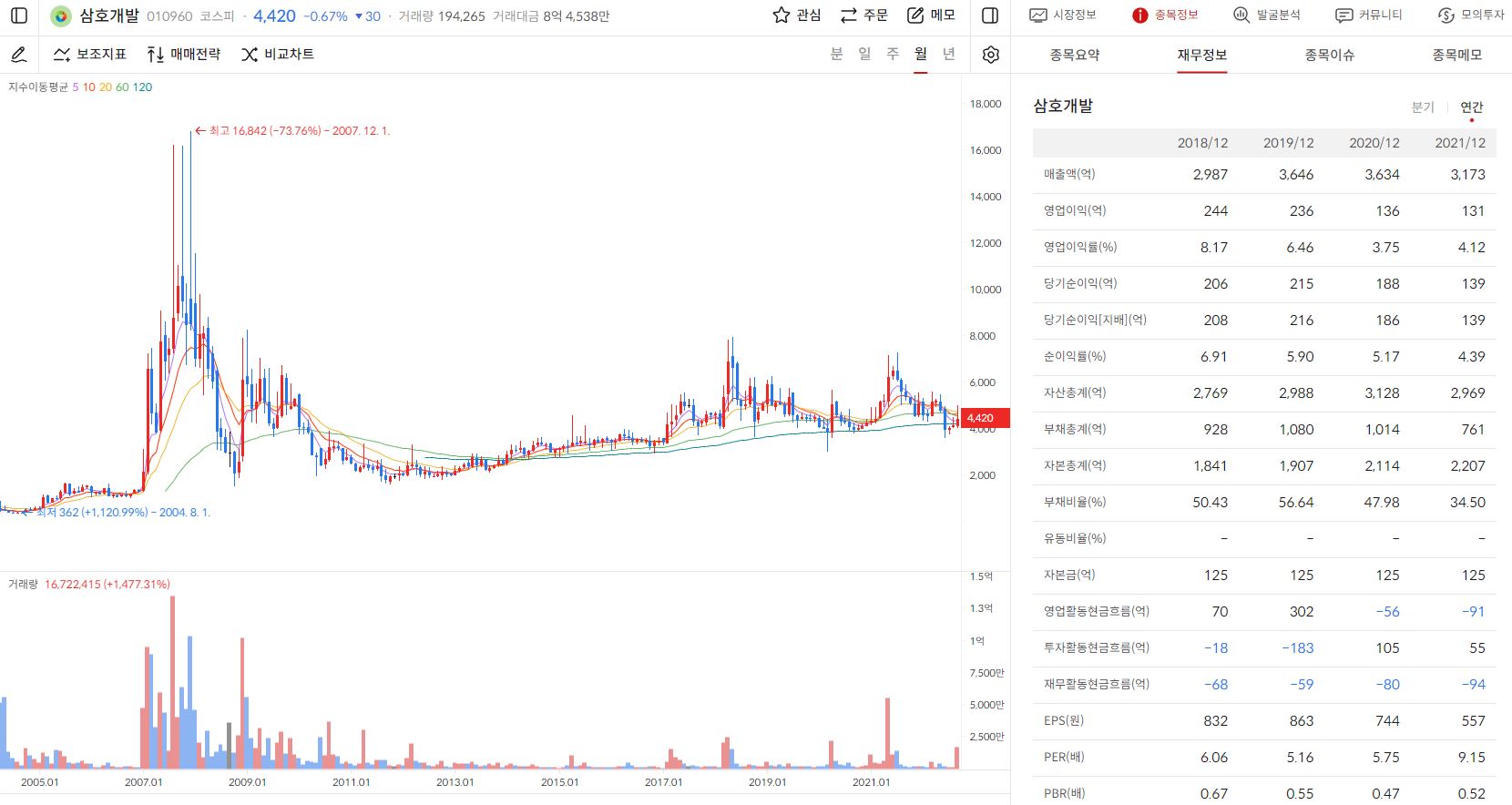 4종목 모두 시가총액 1천억 원대의 작은 규모의 기업이다. 시가총액이 작기 때문에 테마주로 묶이기 쉽고 주가의 등락이 심하다. 영업이익과 영업이익률, 당기순이익 등의 지표로 보면 이화공영과 특수건설은 2021년 기준 적자를 낸 기업이라 투자를 하기가 망설여지는 게 사실이다. 그나마 삼호개발과 동신건설은 당장 흑자는 내고 있는 상황이라 비교적 나아 보인다.