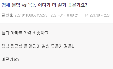 분당과 목동 중 어디가 더 살기 좋으냐는 글이었다.