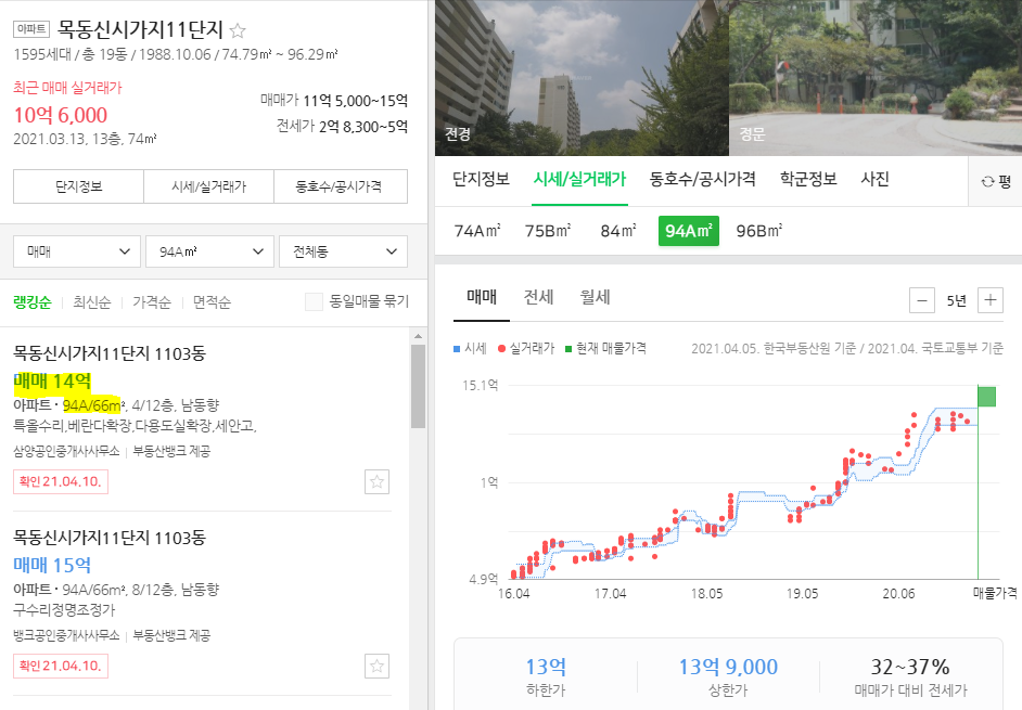 목동11단지의 전용 66제곱미터 시세가 14억~15억정도 한다. 분당의 느티마을3단지와 비슷함을 알 수 있다.