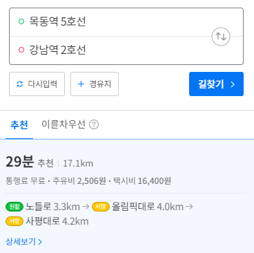 목동역에서 강남역까지, 정자역에서 강남역까지 대중교통과 자동차로 걸리는 시간을 측정해보았다.
