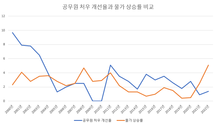IMF 이후 회복 시기였던 2000년 ~ 2004년까지는 공무원에게도 좋은 호시절이었다. 물가 상승 대비 높은 임금 상승을 적용받았기 때문이다. 그러나 이후 2005년 ~ 2010년까지는 물가상승률 대비 낮은 임금 상승률이 적용되었다. 그러나 2011년부터 다시 물가 상승률보다 높은 임금 상승이 이루어져 실질 임금 하락은 피할 수 있었다.