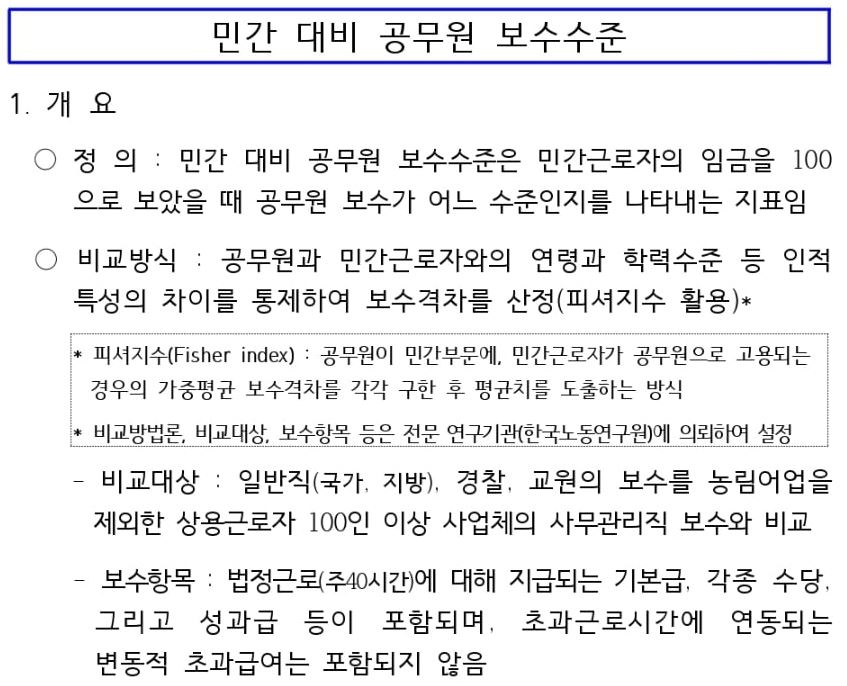 민간 대비 공무원 보수 수준은 2022년 기준 83%로 2000년 이후 역대 최저치를 기록했다. 참고로 민간 대비 공무원 보수 수준이란, 민간근로자(100인 이상 사업체 사무관리직)의 임금을 100으로 보았을 때 공무원 보수가 어느 수준인지를 나타내는 지표이다. 수치가 높으면 민간 대비 공무원 임금 수준이 높다는 의미고, 낮으면 공무원 임금 수준이 낮은 것이라고 해석할 수 있다. 100인 이상 사업체가 기준이기 때문에 통상적인 대기업과 비교할 경우, 수치 차이는 더 많이 나게 된다.