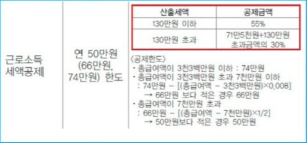 세액공제에서 근로소득이라고 해서 일정금액 세금을 빼준다. 아래와 같은 계산식에 의해 근로소득 세액공제가 이루어진다.