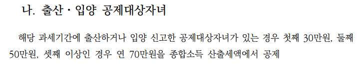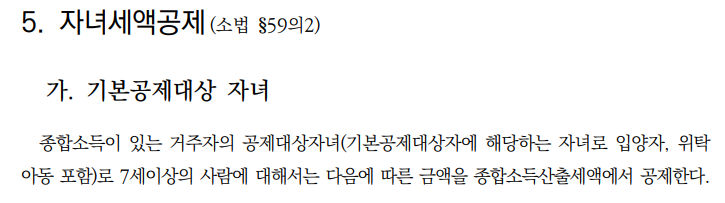 자녀 세액공제는 소득공제의 기본공제와는 다른 공제이다. 공제대상자녀가 7세 이상이어야 자녀 세액공제를 받을 수 있다. 만약 당해에 출산하거나 입양한 자녀가 있다면 추가로 세액공제를 해준다.