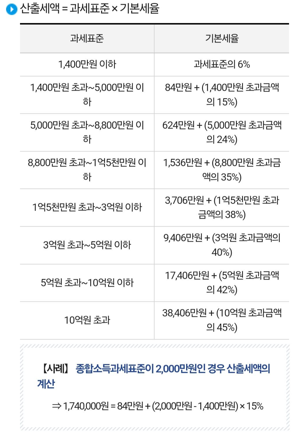 23번 근로소득금액에서 소득공제 받은 금액을 다 제외하고 남은 금액이 49번 종합소득 과세표준이 된다. 근로자의 소득세는 이 49번 종합소득 과세표준 금액을 대상으로 정해지게 된다. 종합소득 과세표준 금액의 밴드에 따라 소득세 계산 방법은 달라지는데, 금액이 높을수록 소득세가 많이 나온다. 소득세 계산 방법은 아래와 같다.