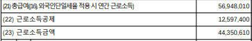 나는 총급여 56,948,010원에서 근로소득공제 12,597,400원을 제외한 44,350,610원이 근로소득금액으로 확정되었다.