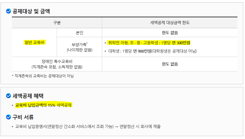 교육비 세액공제는 본인의 경우 한도 없이 세액공제를 받을 수 있고, 부양가족에 대해서는 신분에 따라 연 300만원, 연 900만원 한도에서 세액공제를 받을 수 있다. 세액공제 비율은 의료비처럼 납입금액의 15%이다.