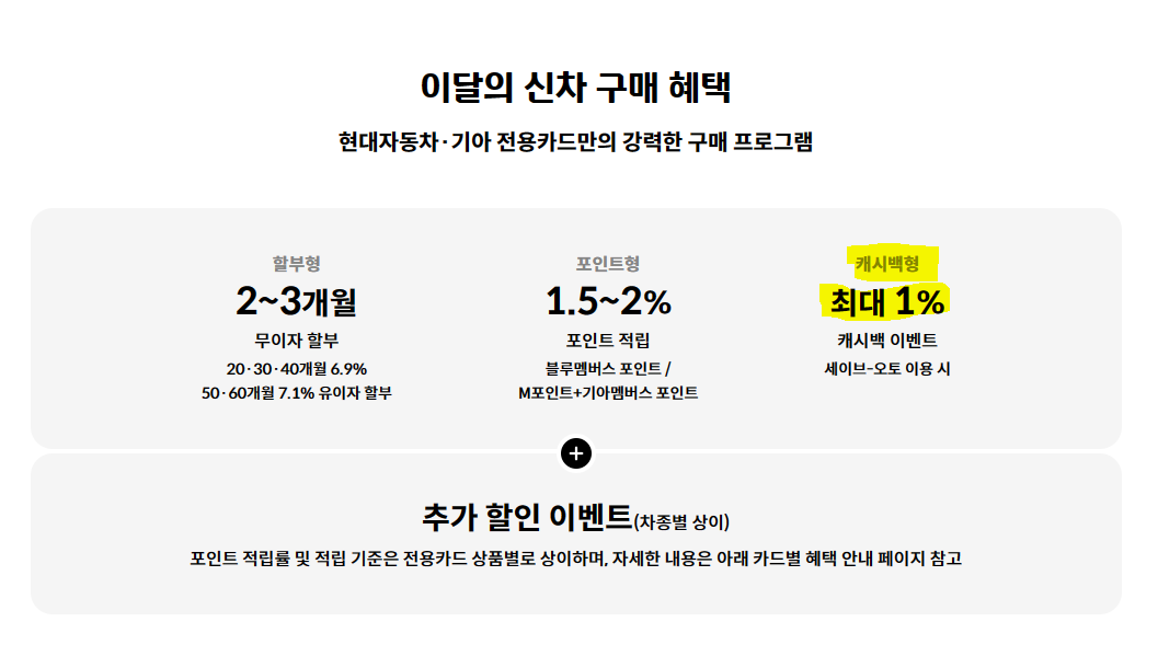 선입금 형태라도 포인트형과 캐시백형을 선택할 수 있는데, 포인트형을 선택하면 블루멤버스 포인트나 기아멤버스 포인트를 캐시백형에 비해 더 많이 받을 수 있다는 장점이 있다. 캐시백형 신청을 위해서는 세이브-오토라는 걸 필수로 이용해야 하는데, 세이브-오토란 쉽게 말해 먼저 자동차 가격을 할인해주고, 할인해준 금액만큼 후에 현대카드를 사용해서 채우는 것이다(적립률 1.5%). 만약 세이브-오토로 30만원을 할인 받았다면, 2,000만원을 현대카드로 결제해서 채워야 한다(기간 내에 못 채우면 현금으로 납부해야 함). 한 마디로 정리하면 현대카드를 주로 쓰지 않는다면 메리트가 없는 혜택이다.