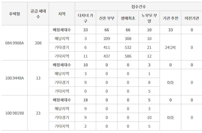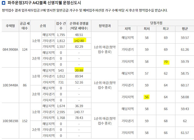 일반공급 특별공급의 경우 최고 경쟁률이 142:1에 달했고 당첨가점도 기타경기지역에서 70점에 달했다.
