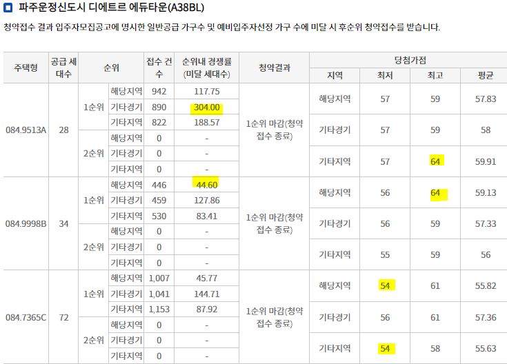 일반공급에서 인기 평형인 84A에서 최대 경쟁률(304:1)이 나왔고 당첨가점 최고점은 64점이었다. 신영지웰 운정신도시보다는 당첨가점이 전반적으로 낮지만 평균 당첨 가점이 50점 후반임을 미뤄보아 쉽게 당첨될 수 있는 아파트는 아니었다.