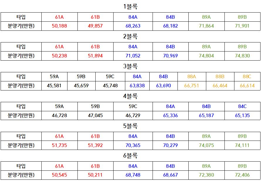 같은 평형에 같은 타입임에도 불구하고 블록별로 분양가가 차이가 있다.